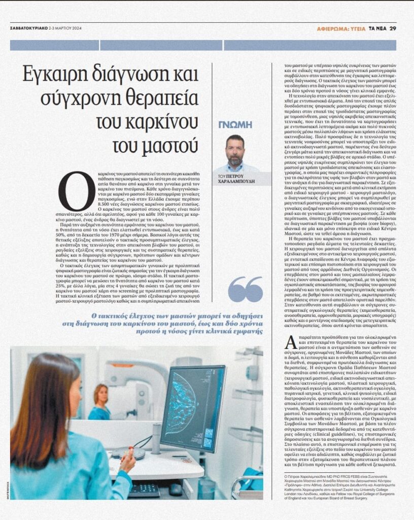 Το άρθρο μας για τον καρκίνο του μαστού στην εφημερίδα Τα Νέα Σαββατοκύριακο 3/24