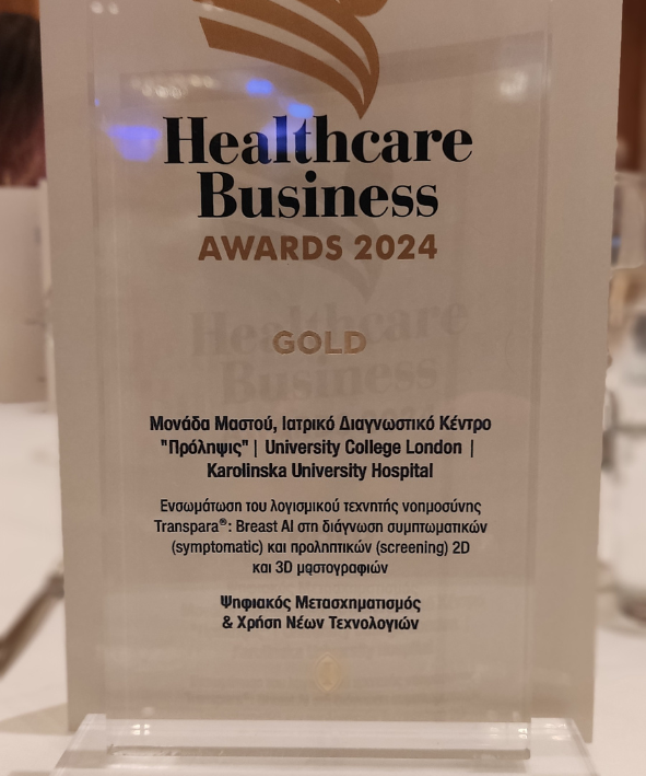 Η Μονάδα Μαστού του Ιατρικού Διαγνωστικού Κέντρου ΄Πρόληψις’ απέσπασε το Χρυσό Βραβείο στα φετινά Healthcare Business Awards στην κατηγορία Ψηφιακού Μετασχηματισμού και Χρήσης Νέων Τεχνολογιών, για την ενσωμάτωση της Τεχνητής Νοημοσύνης στην ψηφιακή μαστογραφία και την τομοσύνθεση.