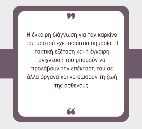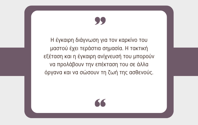 Η έγκαιρη διάγνωση για τον καρκίνο του μαστού έχει τεράστια σημασία. Η τακτική εξέταση και η έγκαιρη ανίχνευσή του μπορούν να προλάβουν την επέκταση του σε άλλα όργανα και να σώσουν τη ζωή της ασθενούς. Οι εξετάσεις από εξειδικευμένο μαστολόγο, η μαστογραφία και το υπερηχογράφημα μαστού καθώς και η αυτοεξέταση πρέπει να γίνονται ανά τακτά χρονικά διαστήματα, όπως ορίζονται στις διεθνείς κατευθυντήριες οδηγίες.